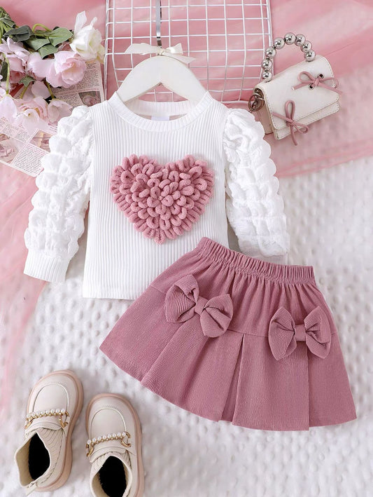 طقم من قطعتين: بلوزة بأكمام طويلة منفوخة مزينة بقلب مطرز + تنورة