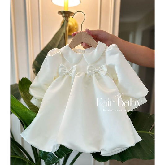 Girl long sleeve dress with bow knot and 2 pockets pink color