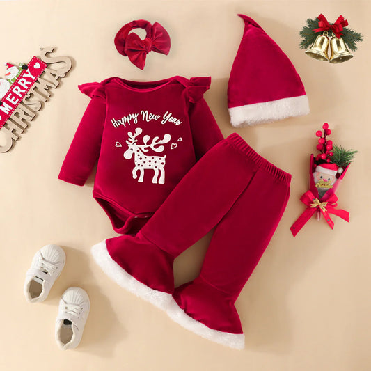 4 pcs set Baby Christmas happy new year Letter Print Plush Long Sleeve romper + pants+headband+hat