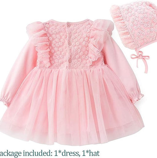 set of 2 pcs long sleeve dress with bow at waist + hat for baby girls 3 colors