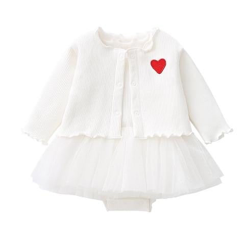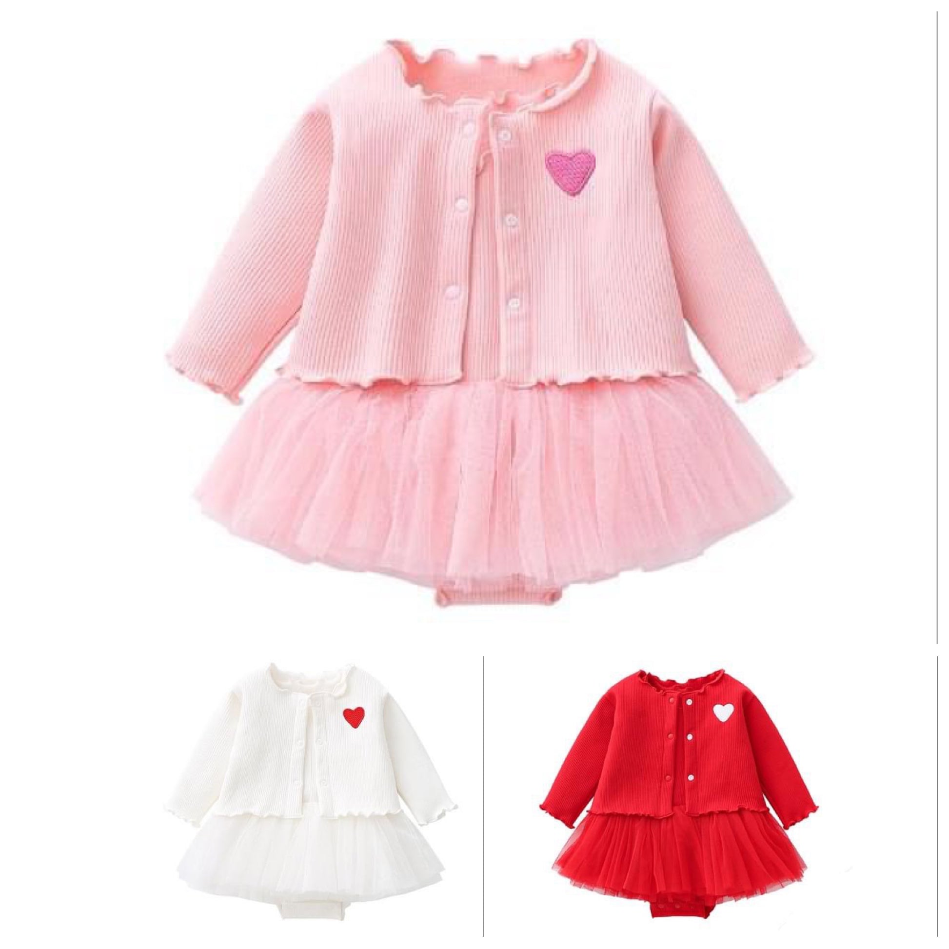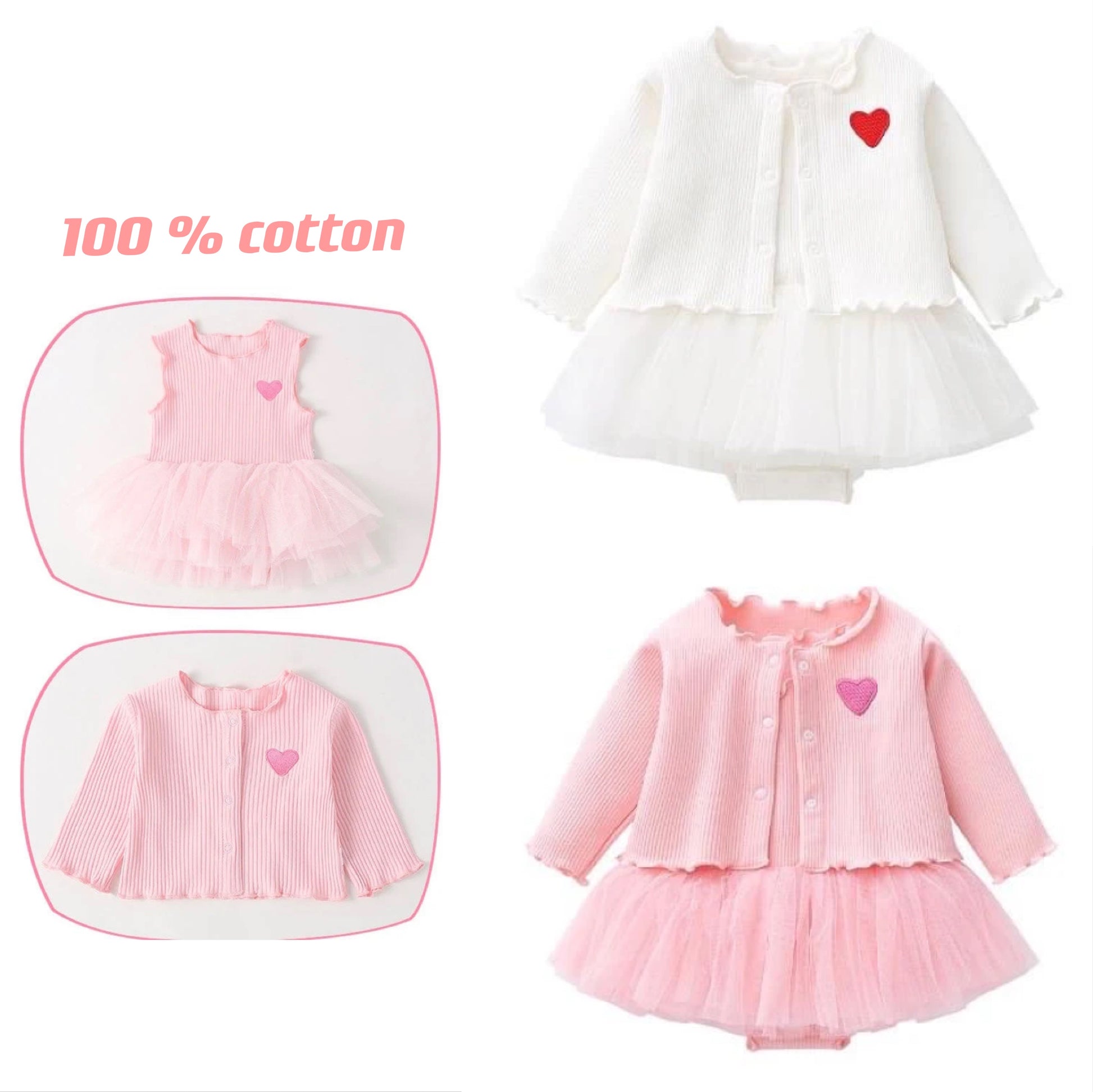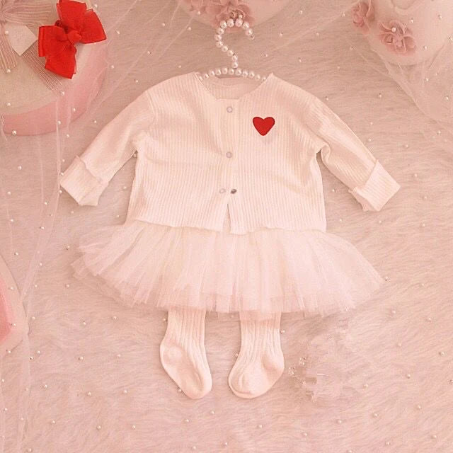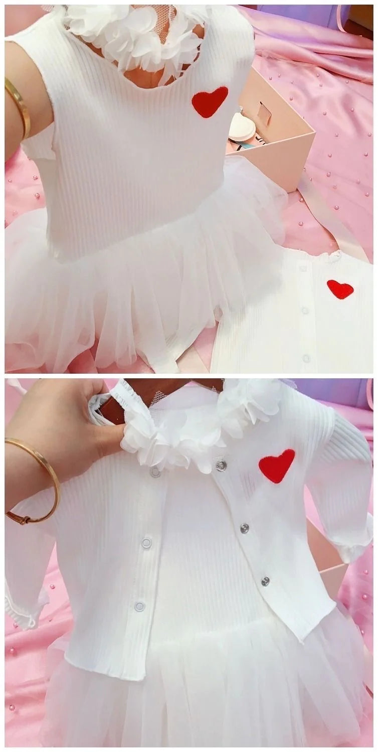2 piece set 100% cotton knitted long sleeve baby embroidered heart cardigan+tulle dress 3 colors