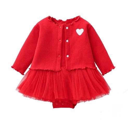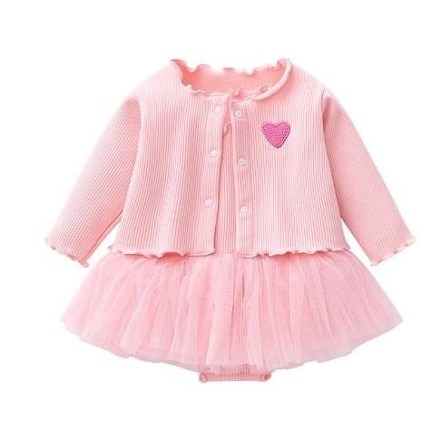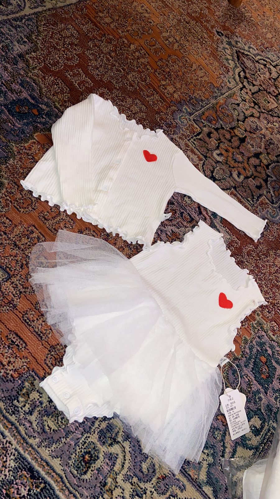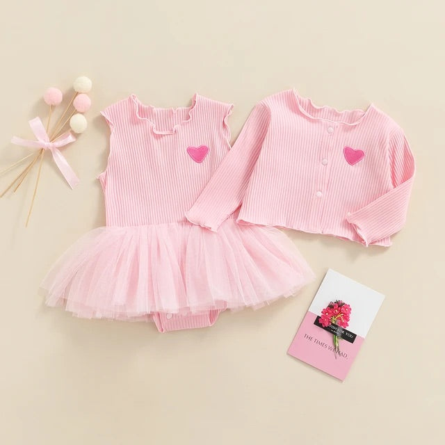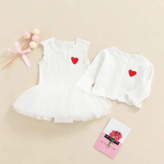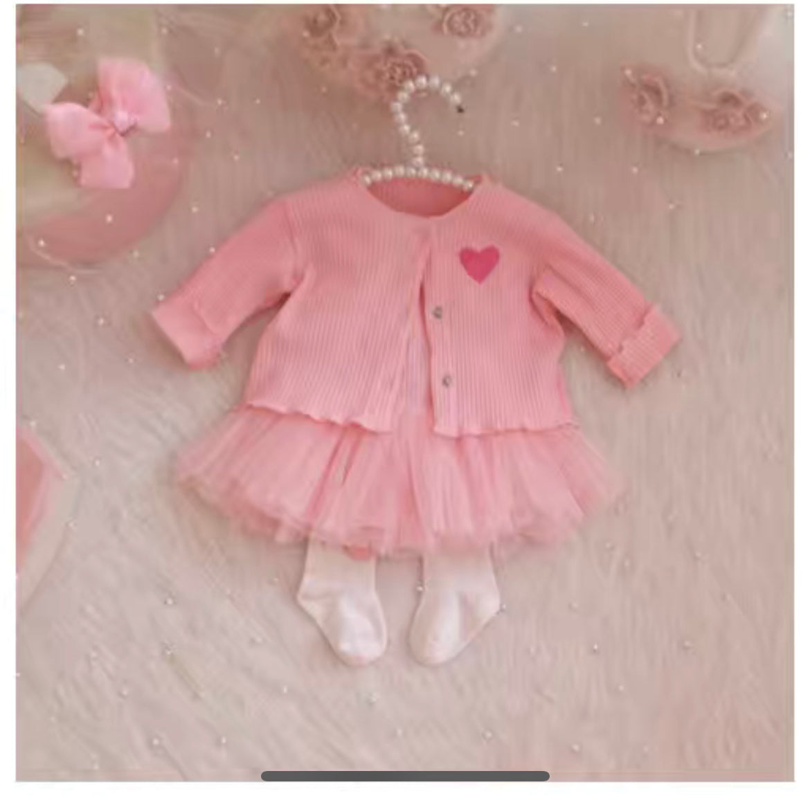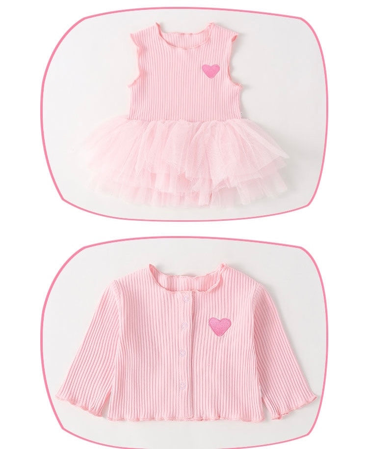 2 piece set 100% cotton knitted long sleeve baby embroidered heart cardigan+tulle dress 3 colors