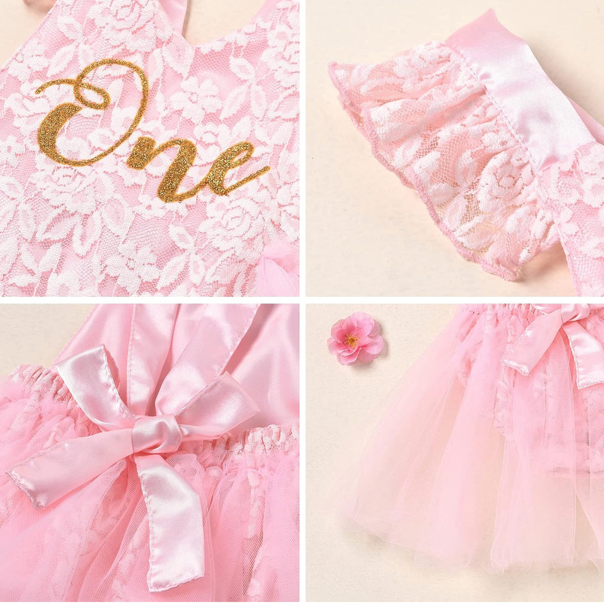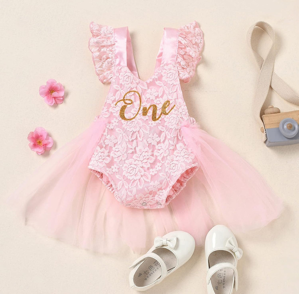 For 1st birthday Baby backless lace romper dress with number “one”pink color