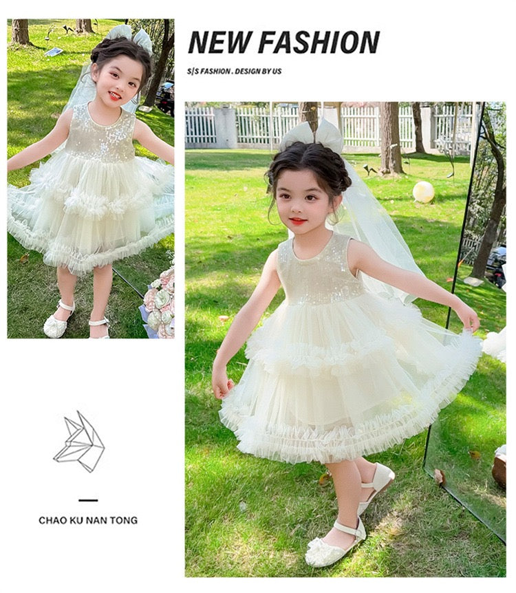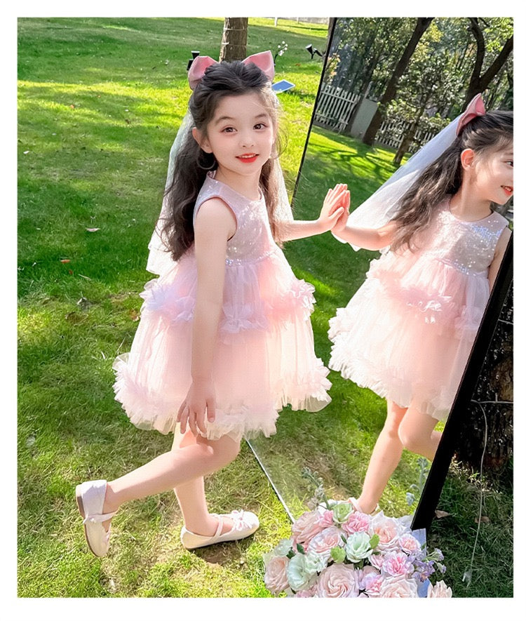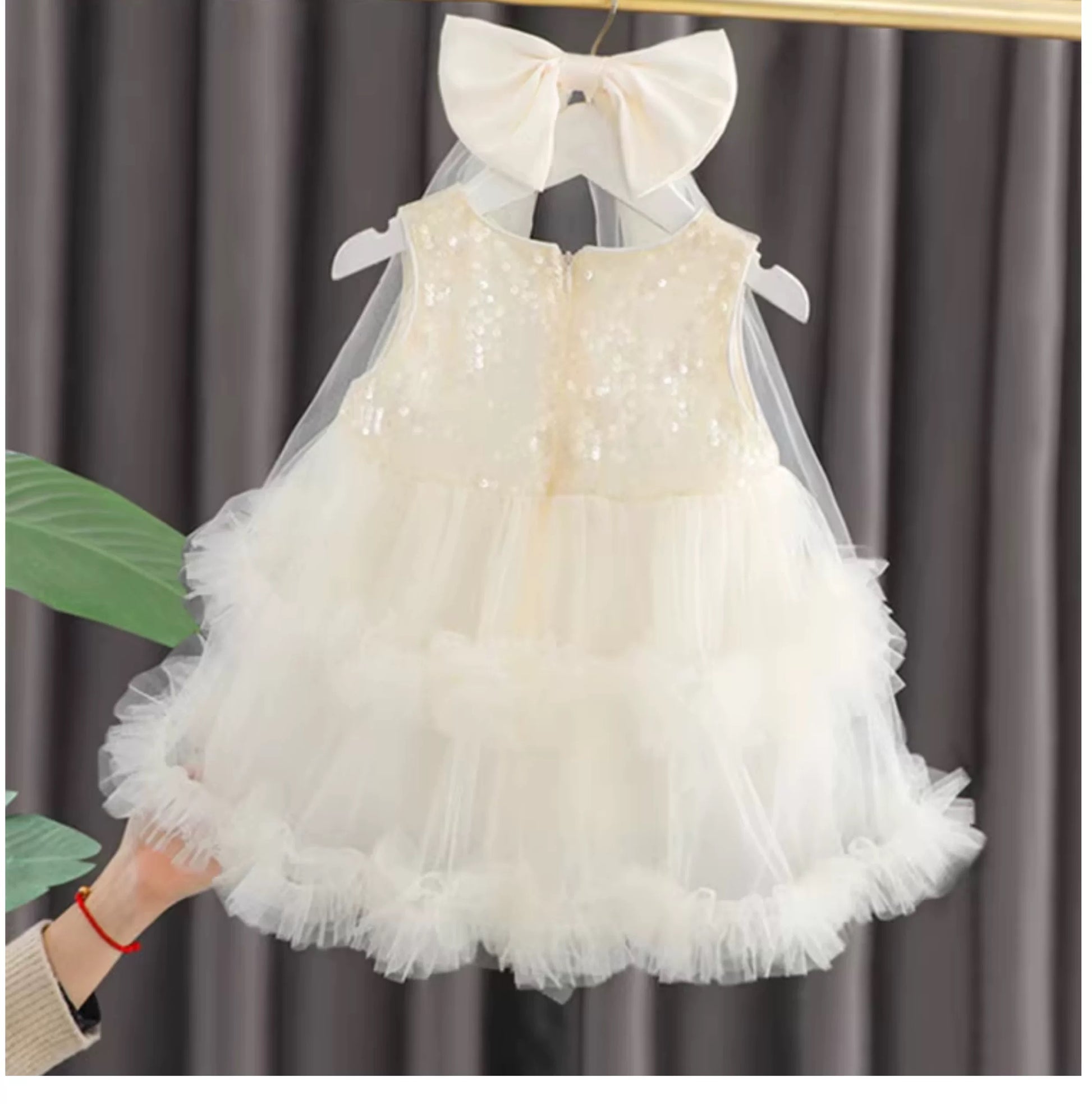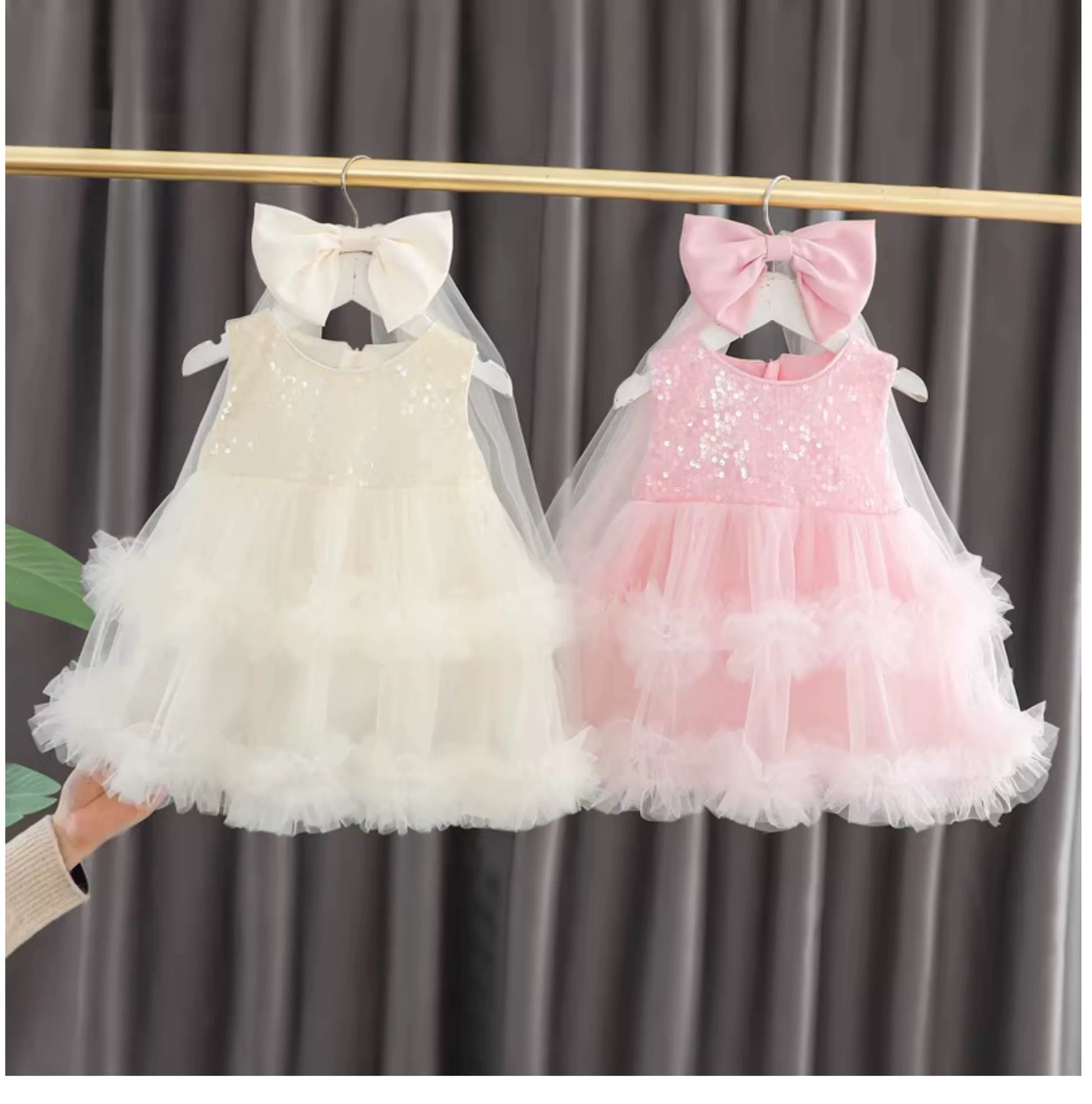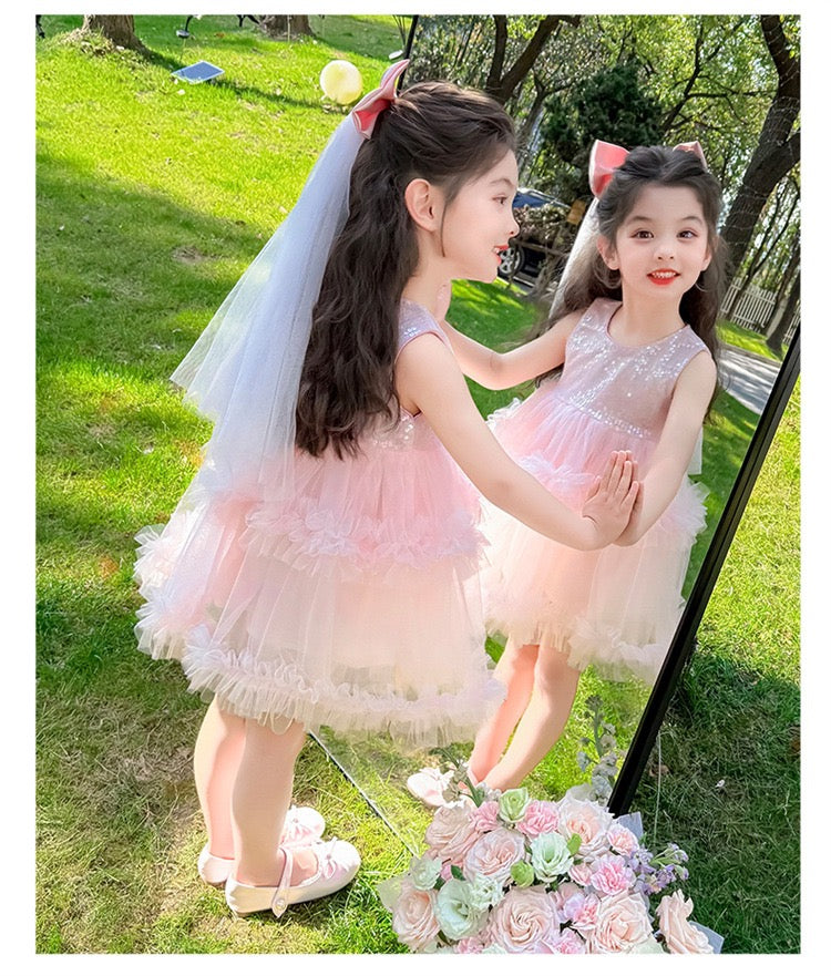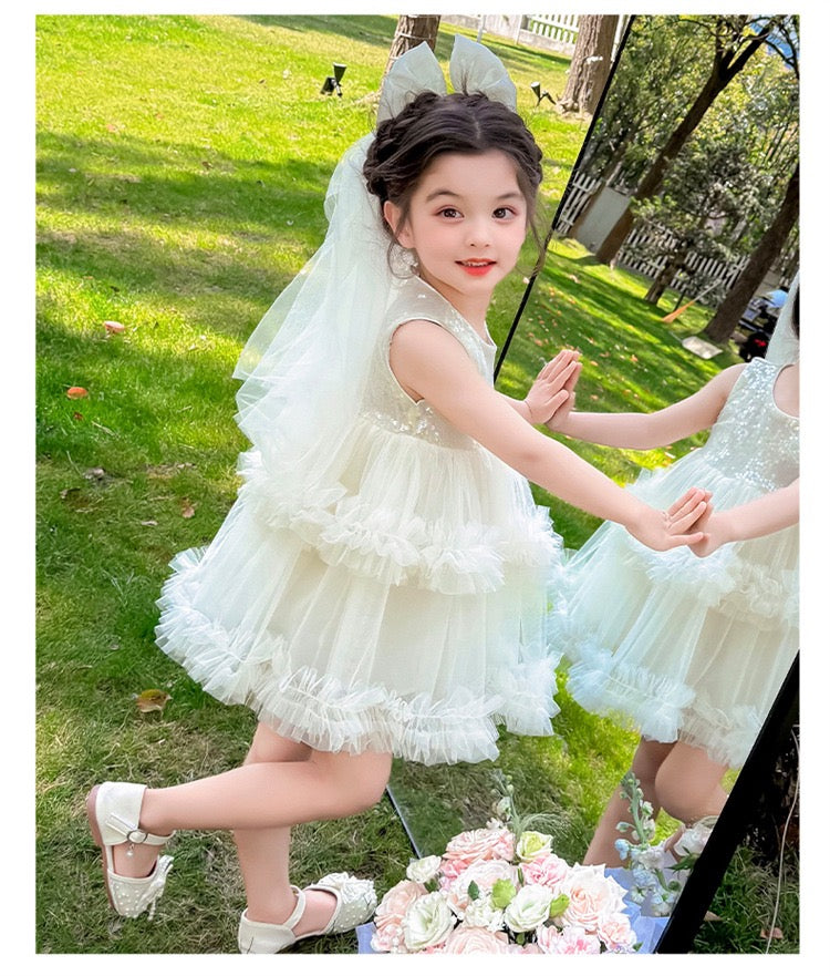 Set of 2 pcs Multi layered princess dress very soft with sequins + hair clip with big bow and tulle
