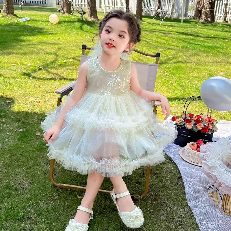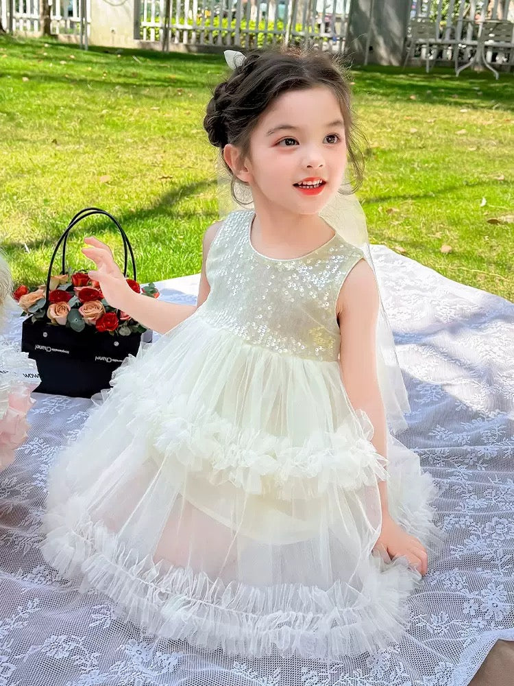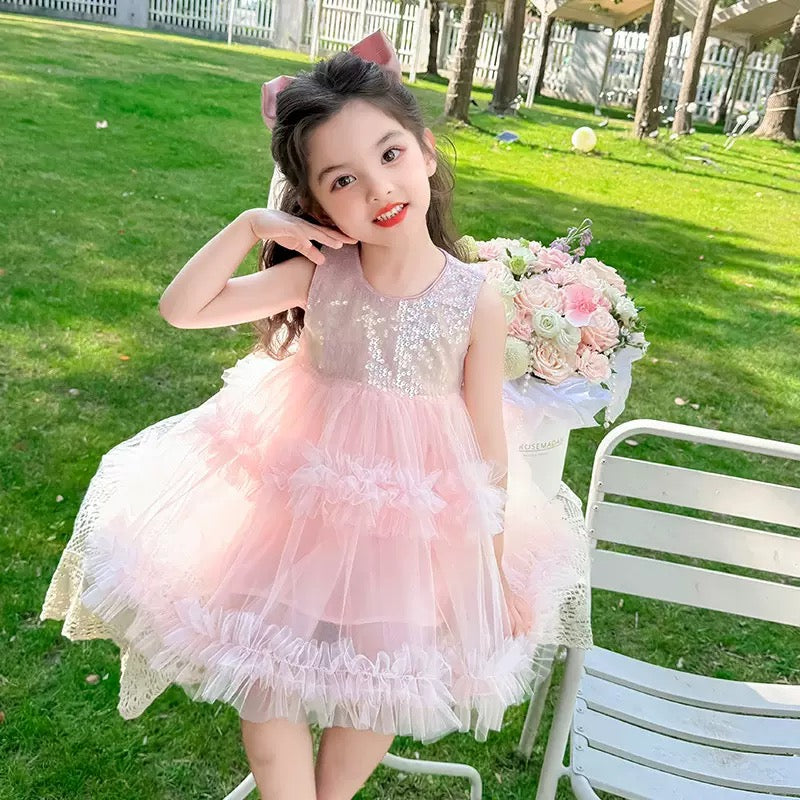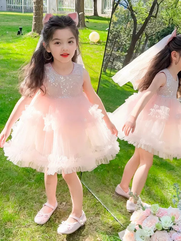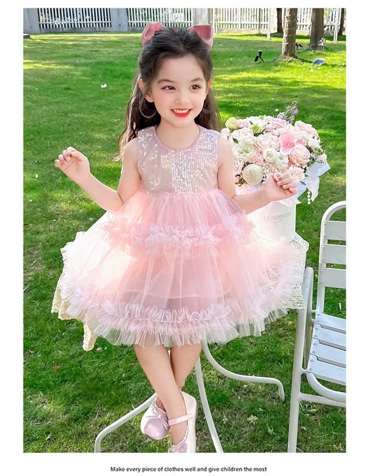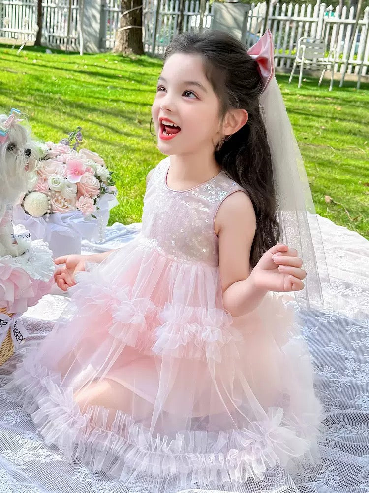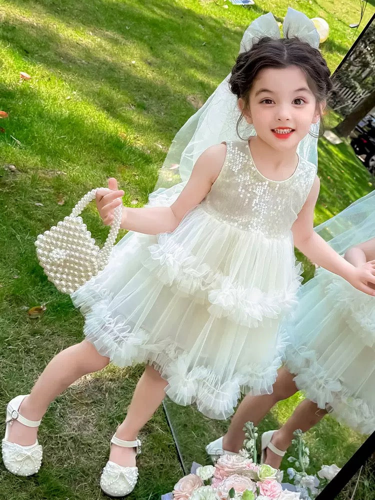 Set of 2 pcs Multi layered princess dress very soft with sequins + hair clip with big bow and tulle