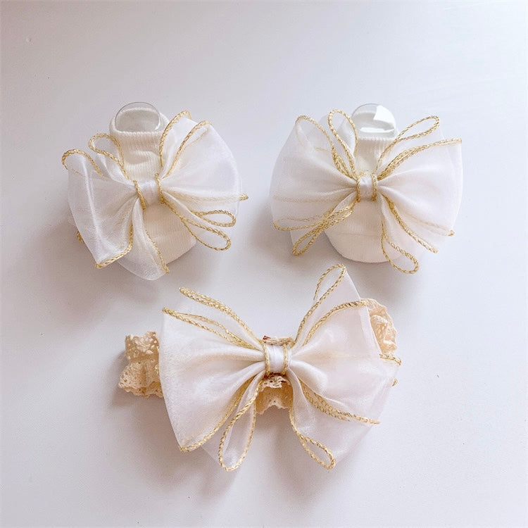 طقم مكون من قطعتين من جوارب الأطفال وعصابة الرأس وعقدة على شكل فيونكة بإطار ذهبي- توكة و شراب