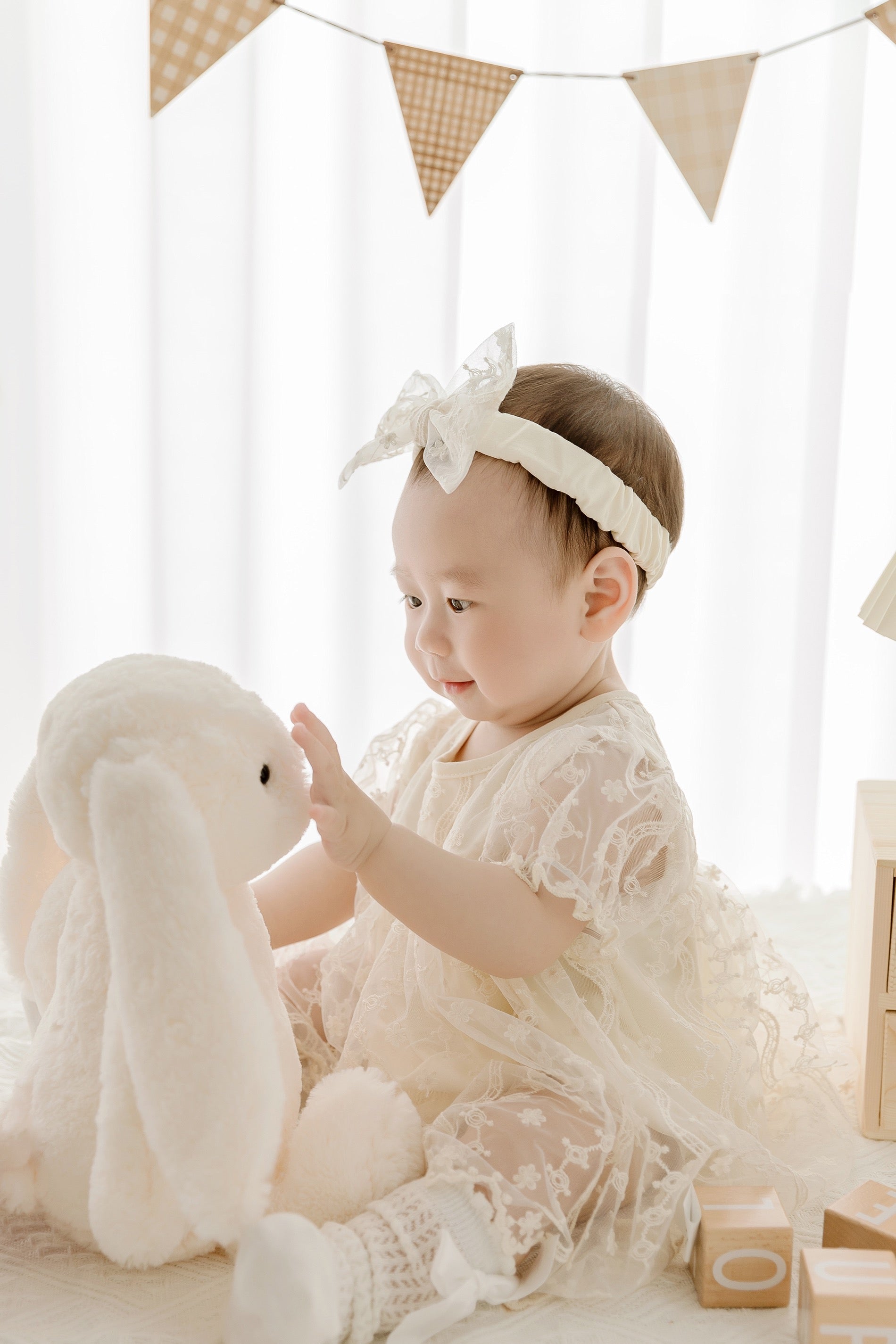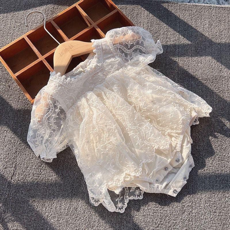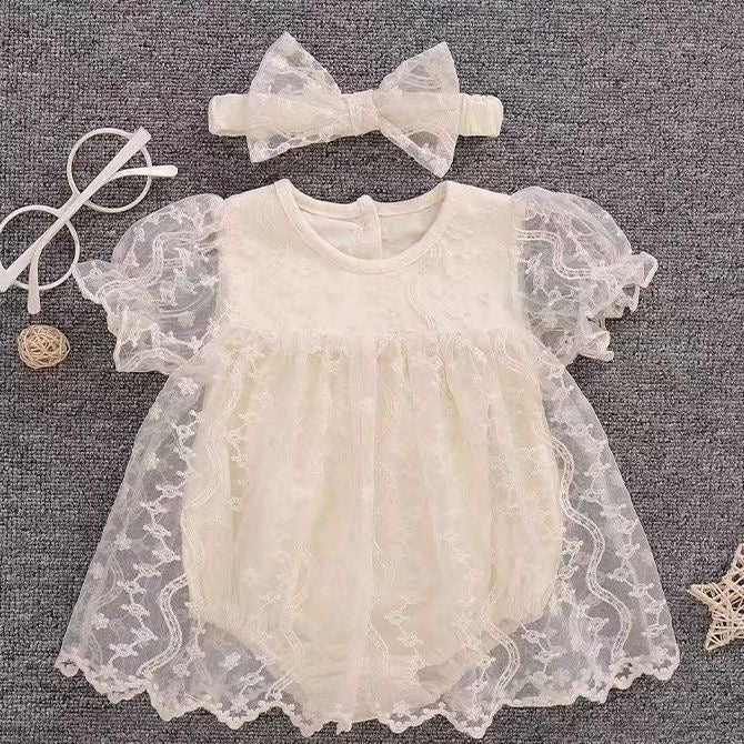 فستان أطفال من الدانتيل باللون البيج مع عصابة رأس