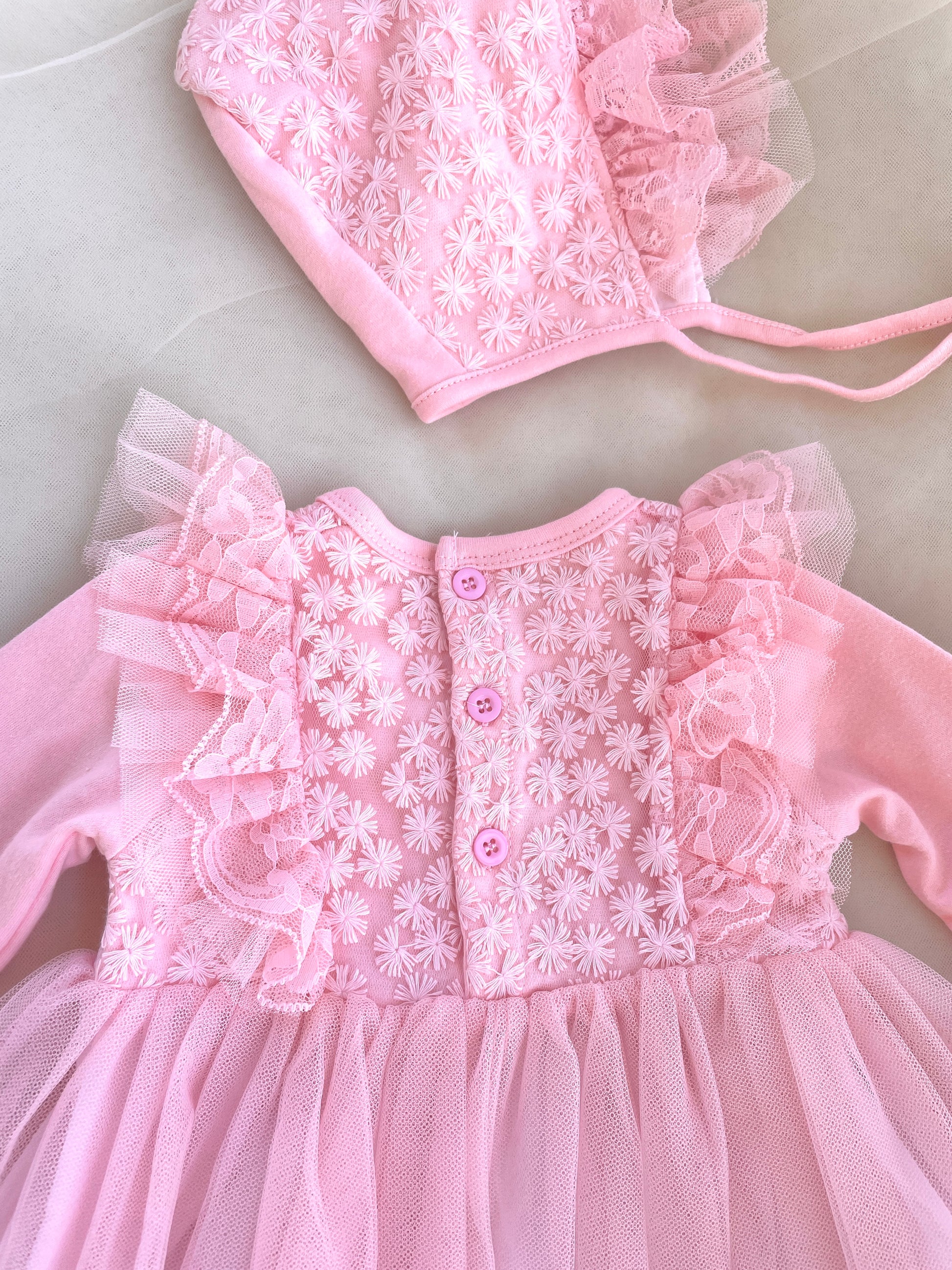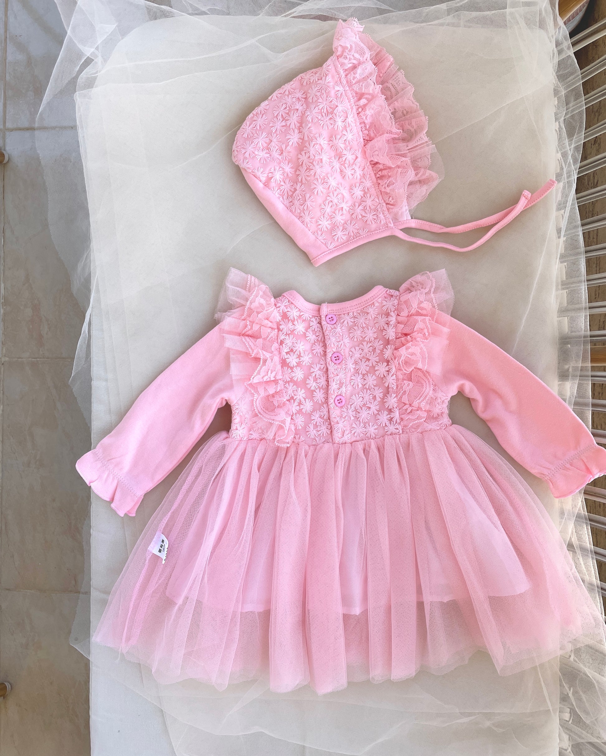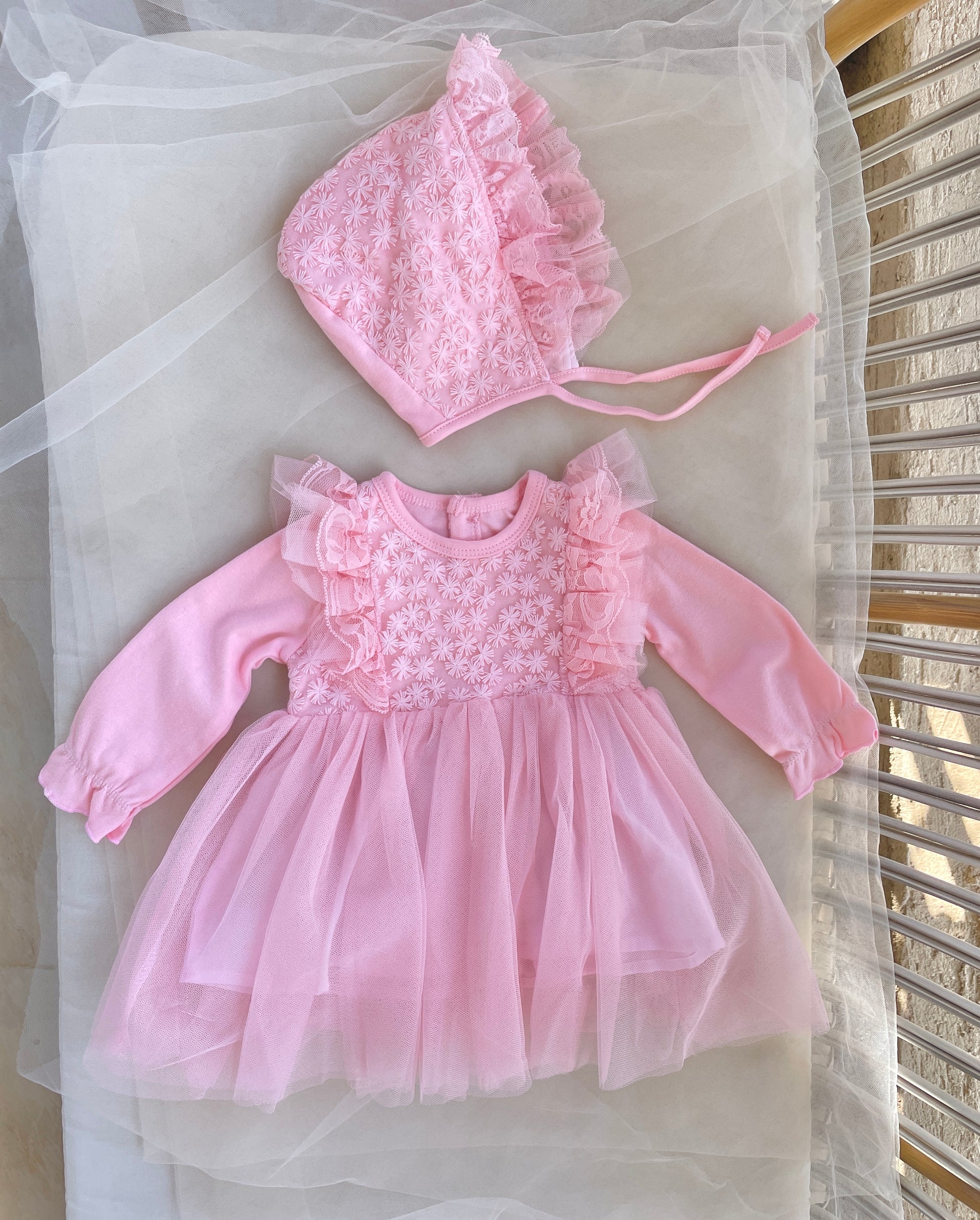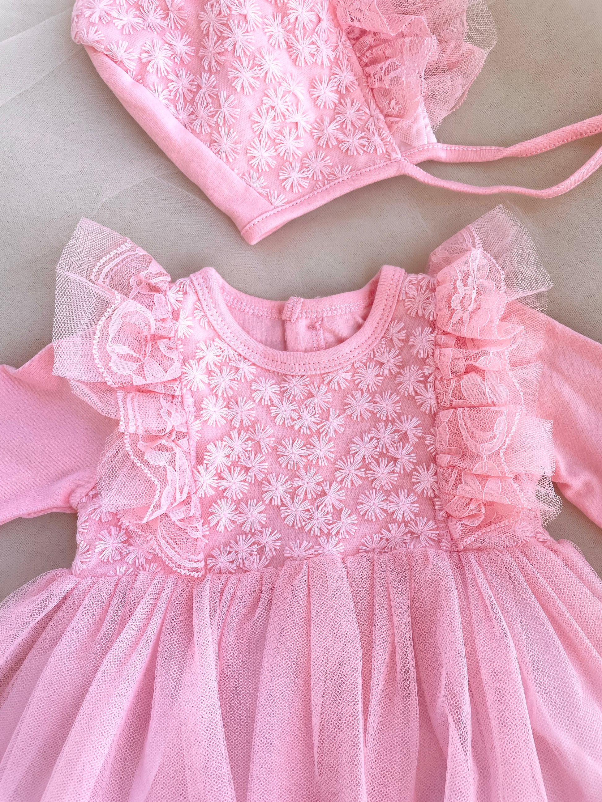 فستان طفل مع قبعة مطرزة الهندباء باللون البينك