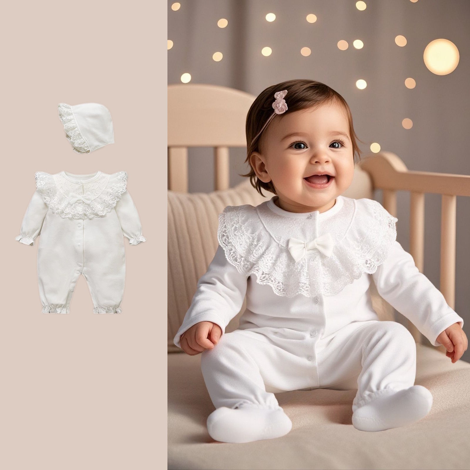 جمبسوت مريح للأطفال بأكمام طويلة مع قبعة باللون الأبيض سالوبيت