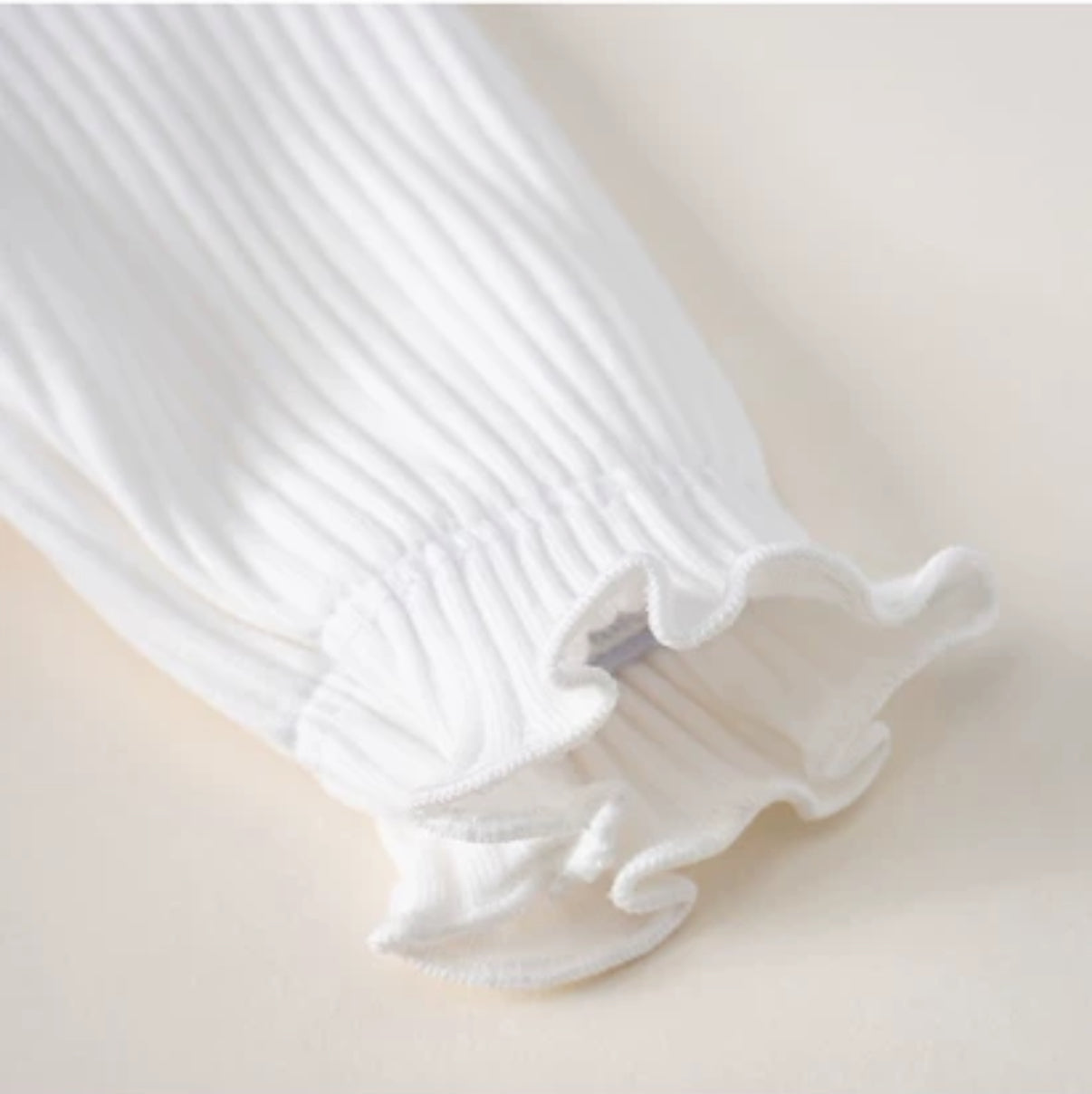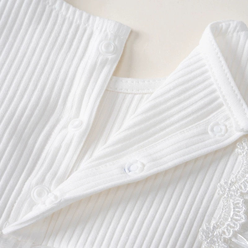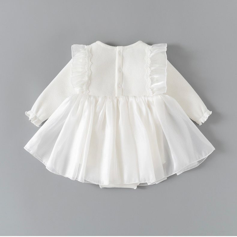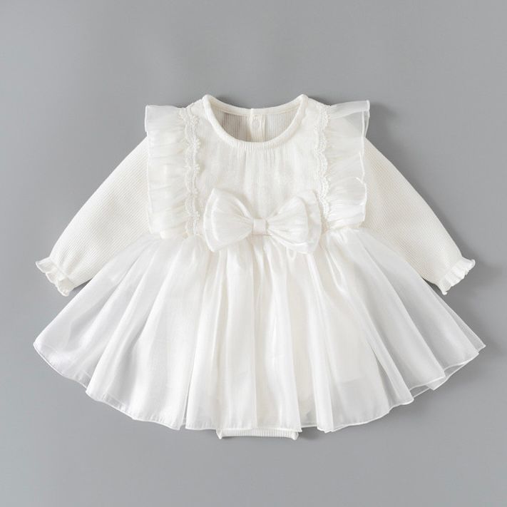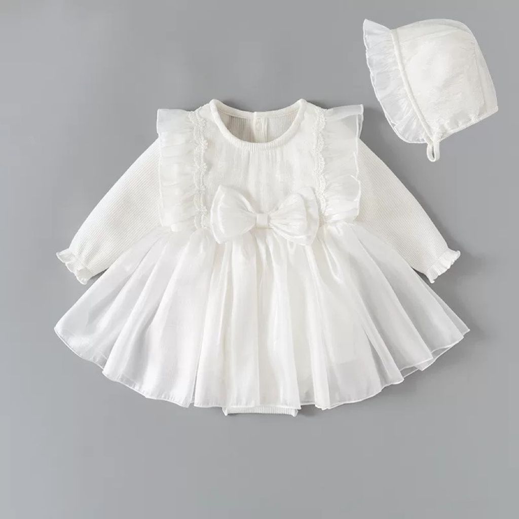 فستان رومبر أبيض بأكمام طويلة للأطفال مع فيونكة وقبعة