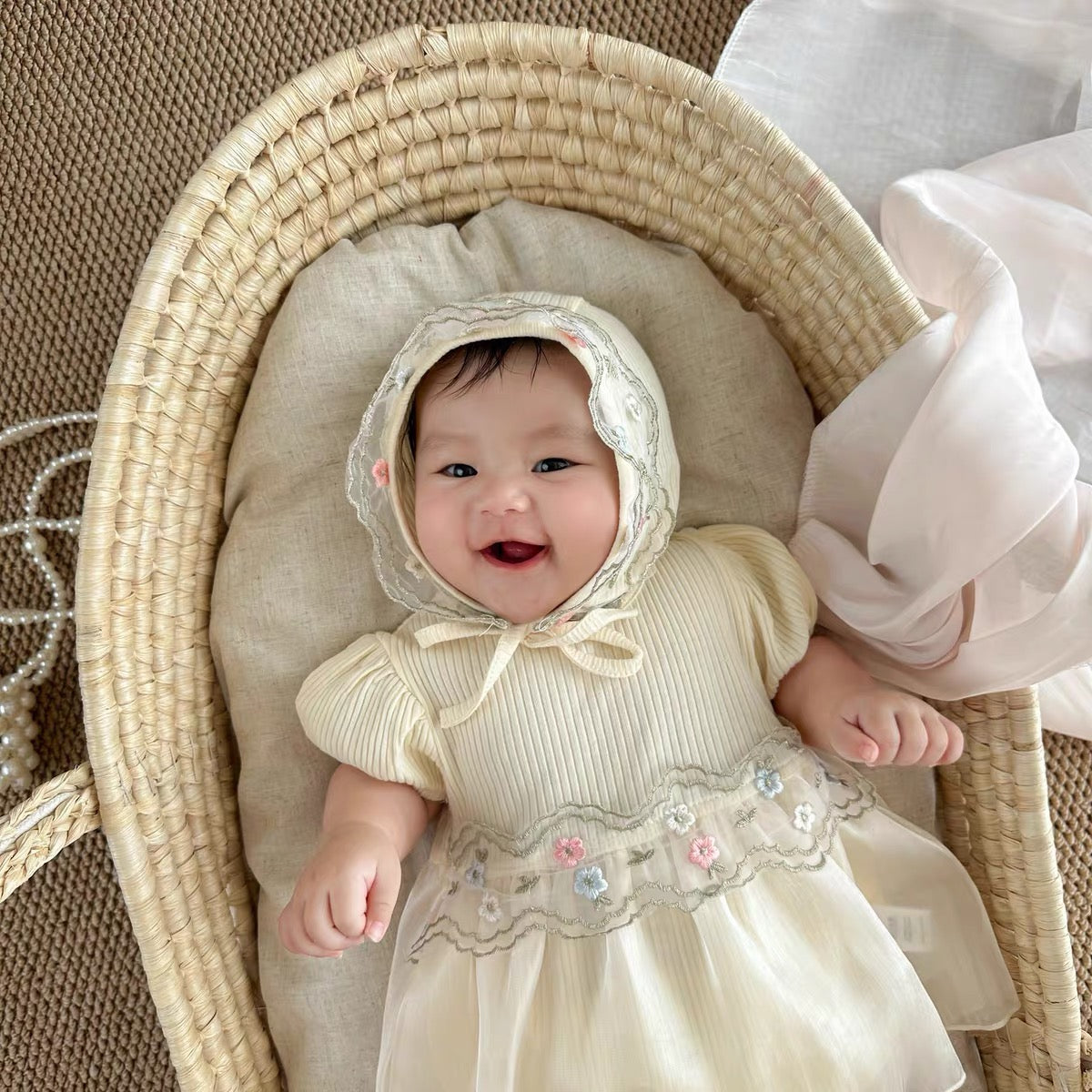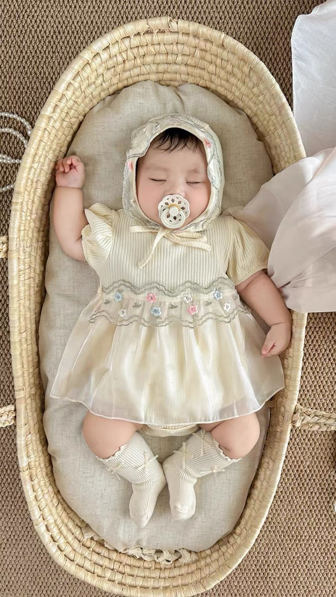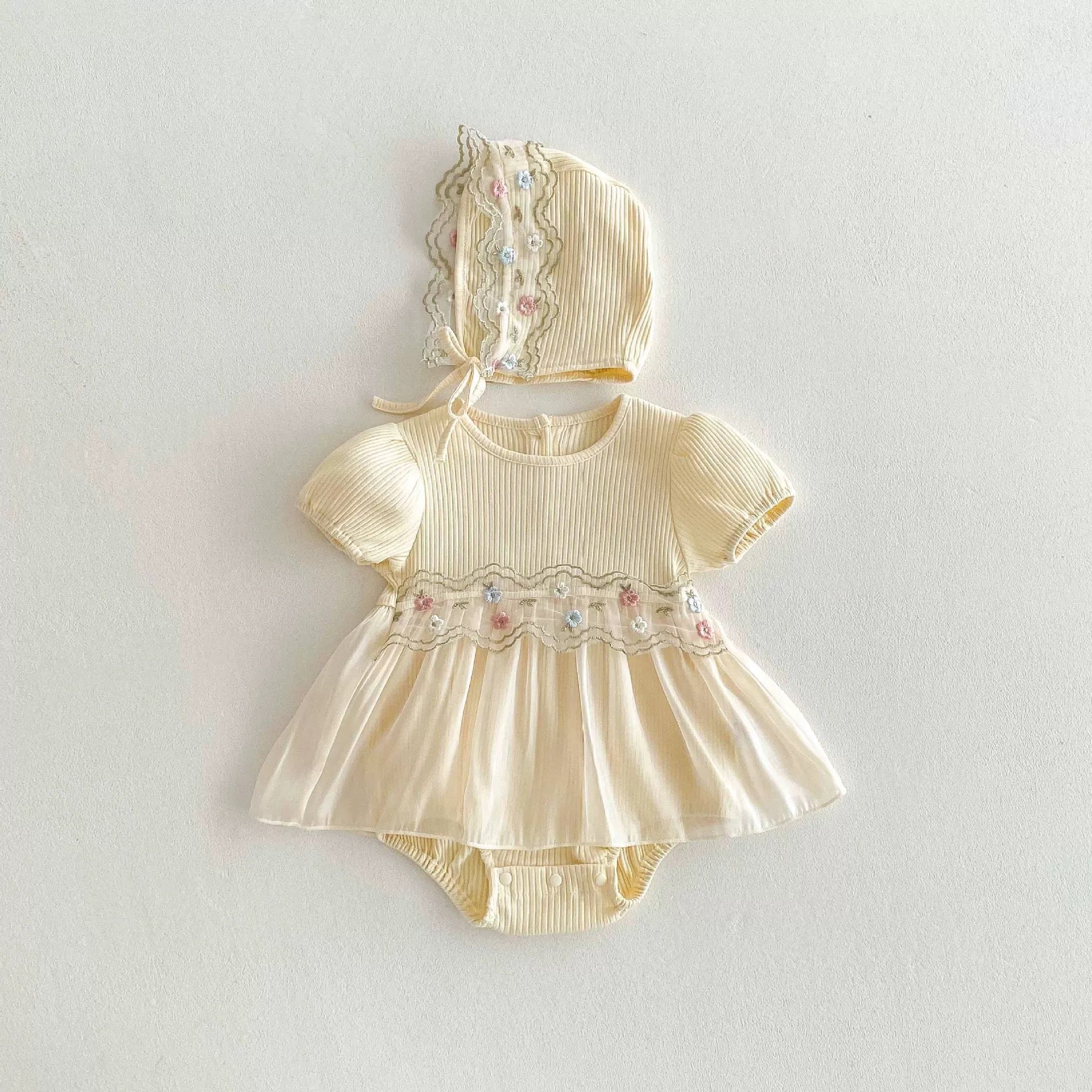 2pcs set Beige baby romper dress with embroidered flowers + hat