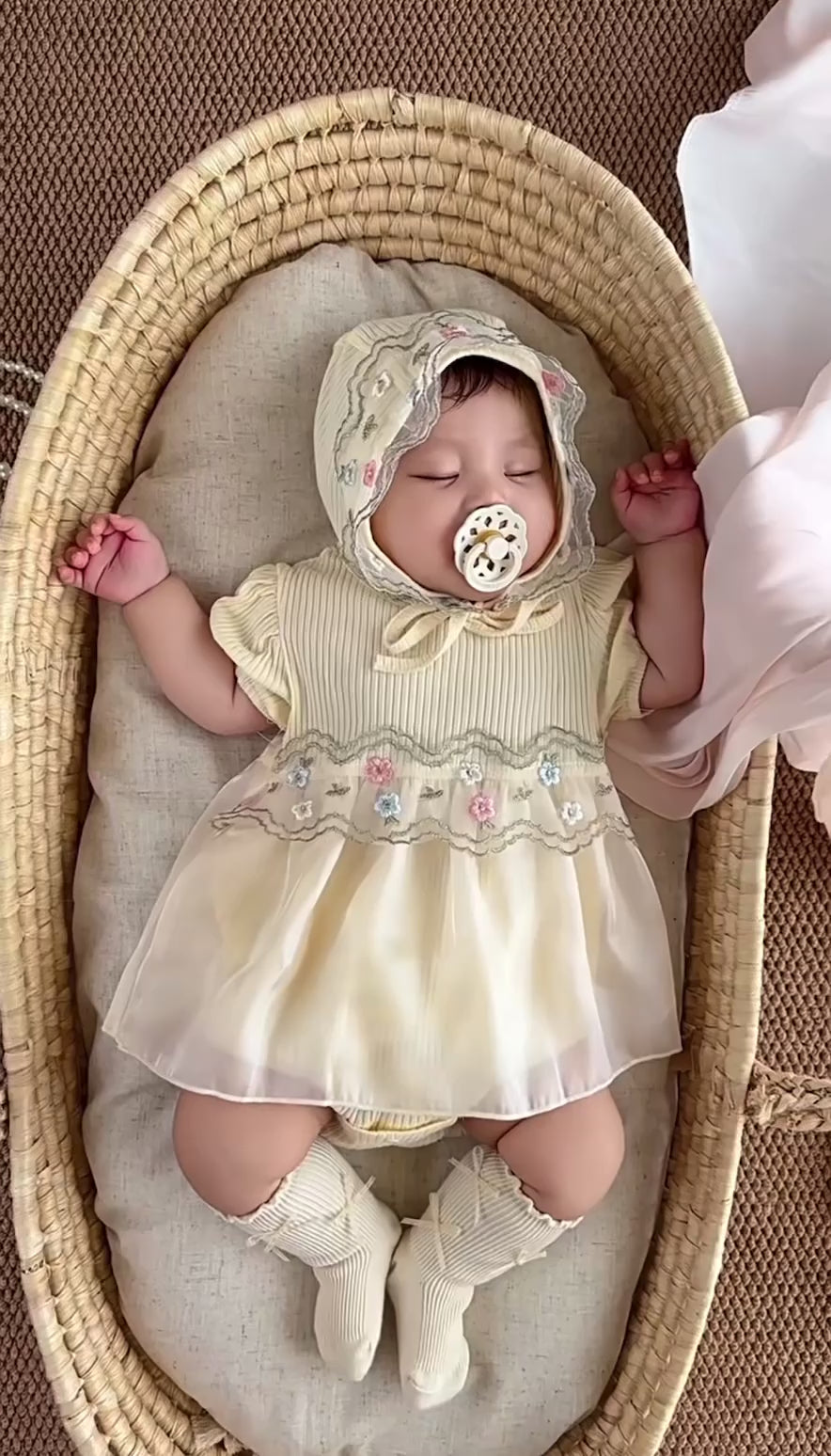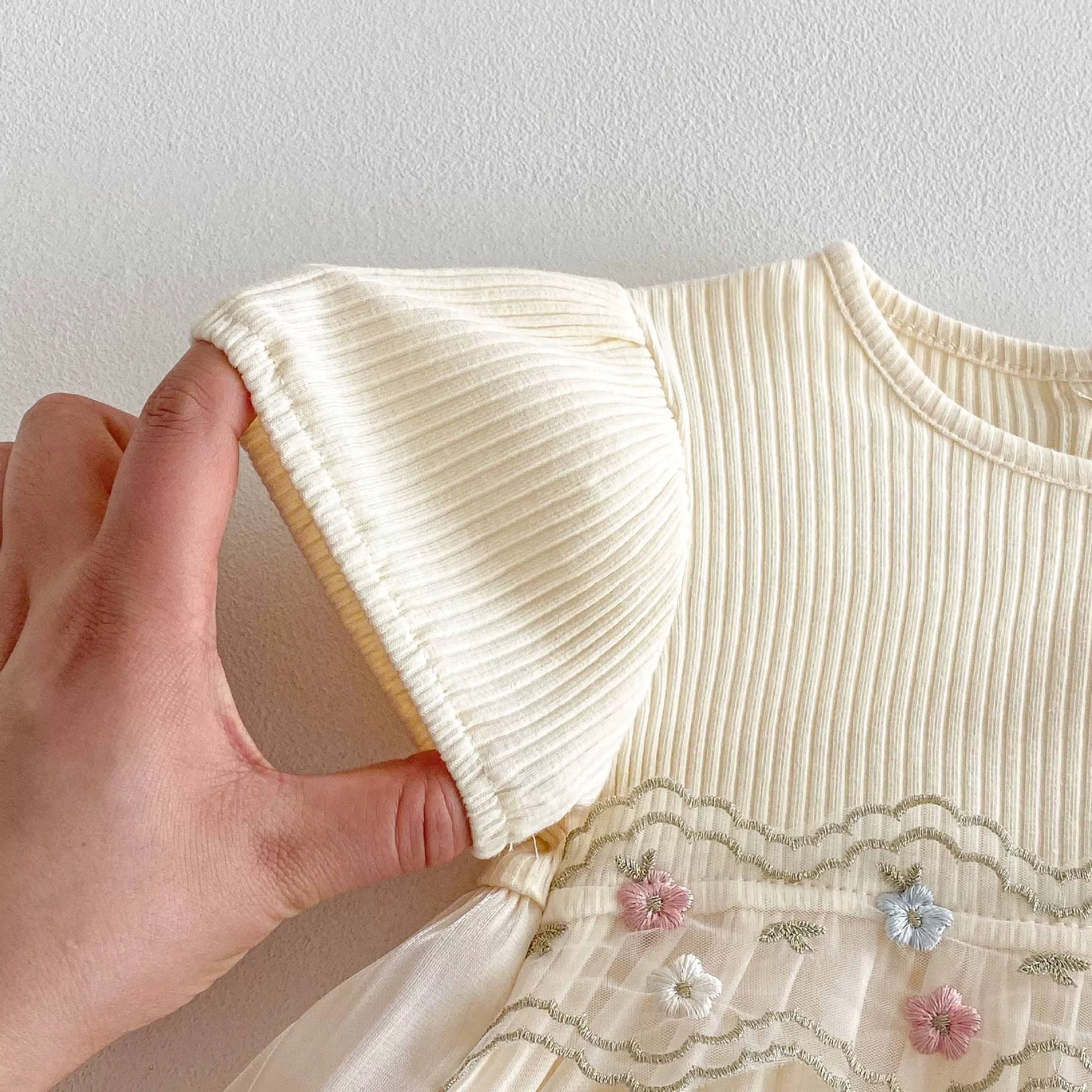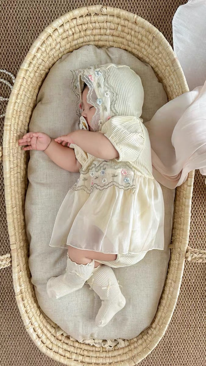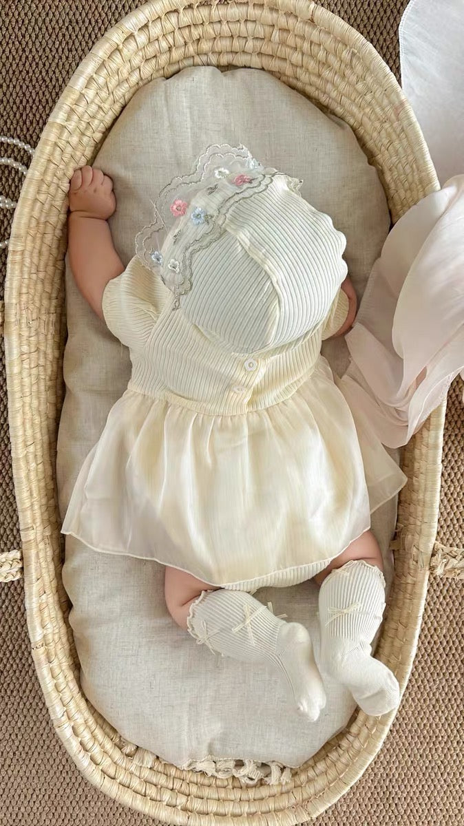 2pcs set Beige baby romper dress with embroidered flowers + hat