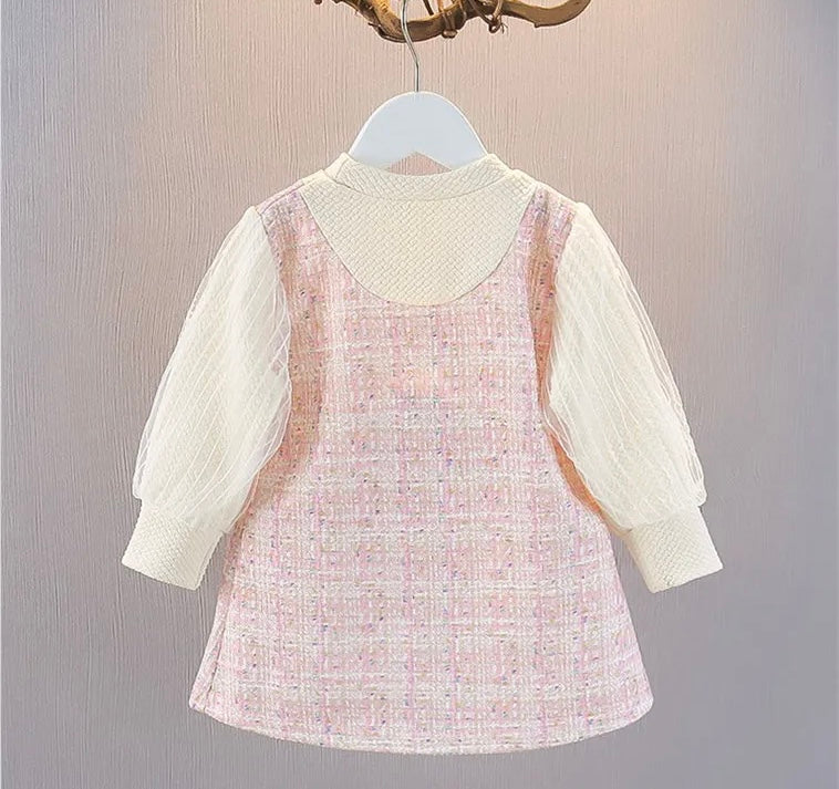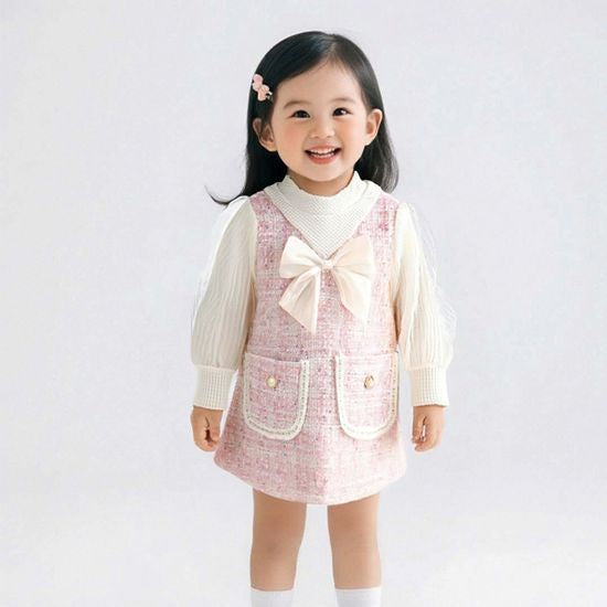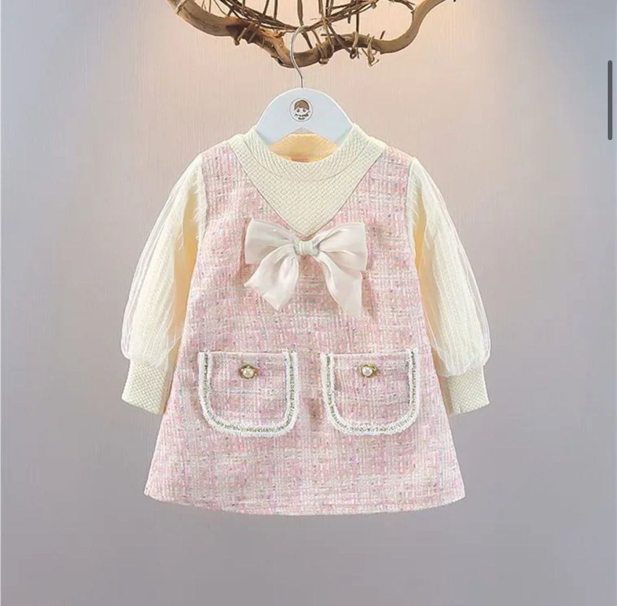 فستان بناتي بأكمام طويلة مع عقدة فيونكة وجيبين باللون الوردي