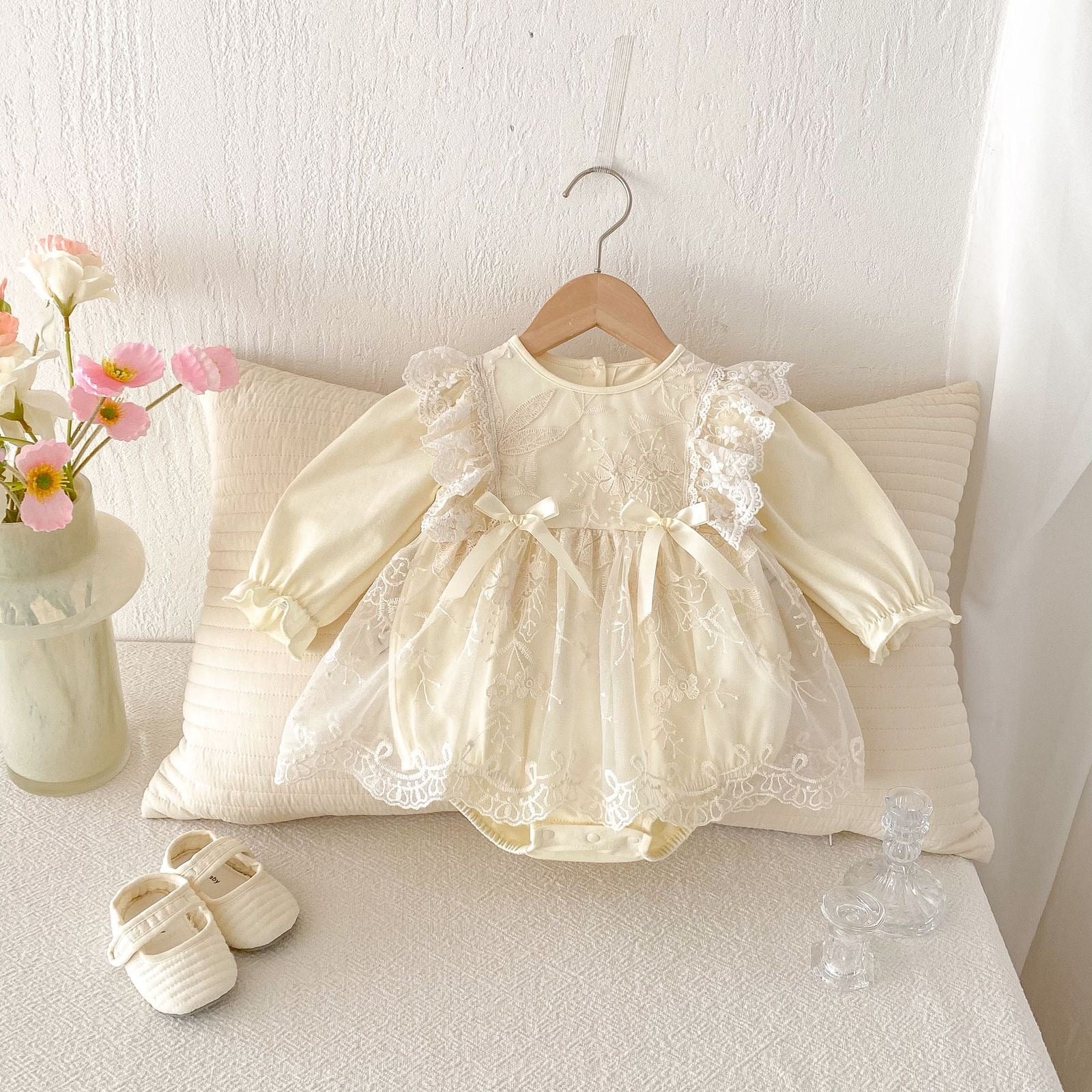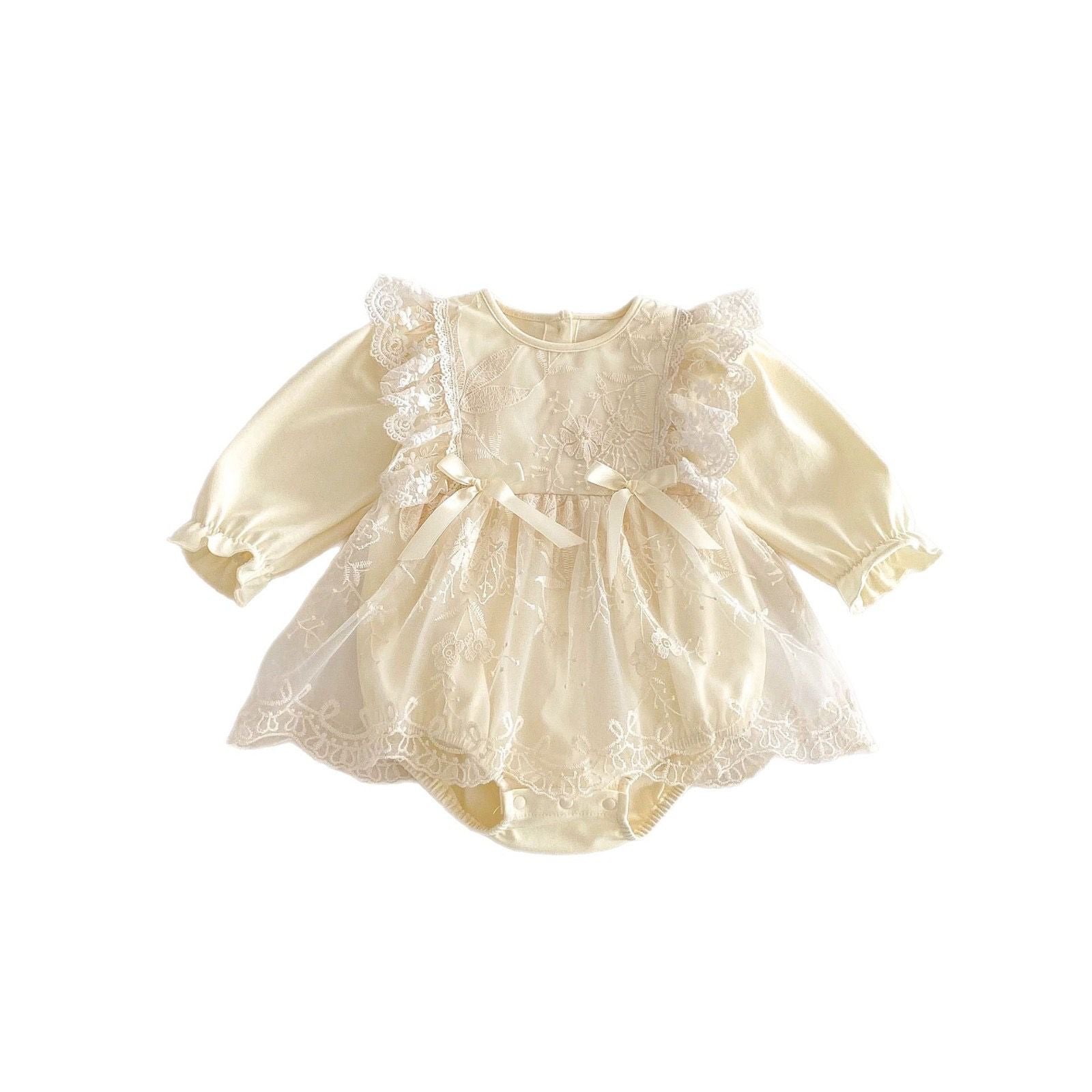 Long sleeve baby beige romper dress with 2 bows