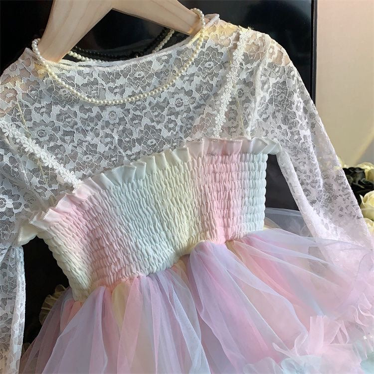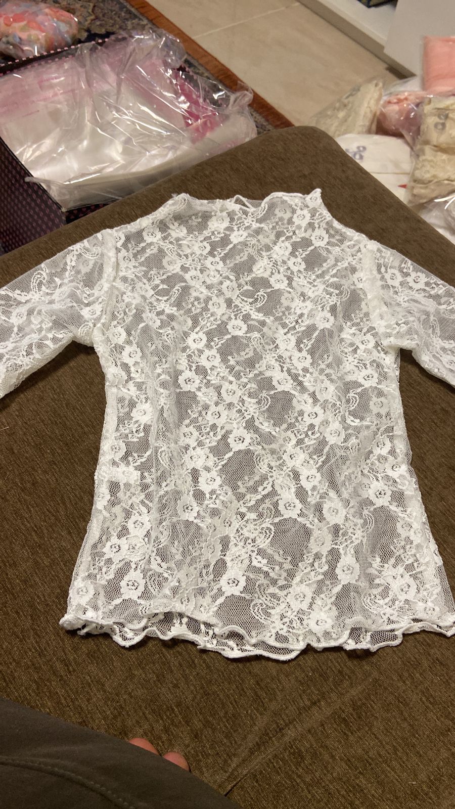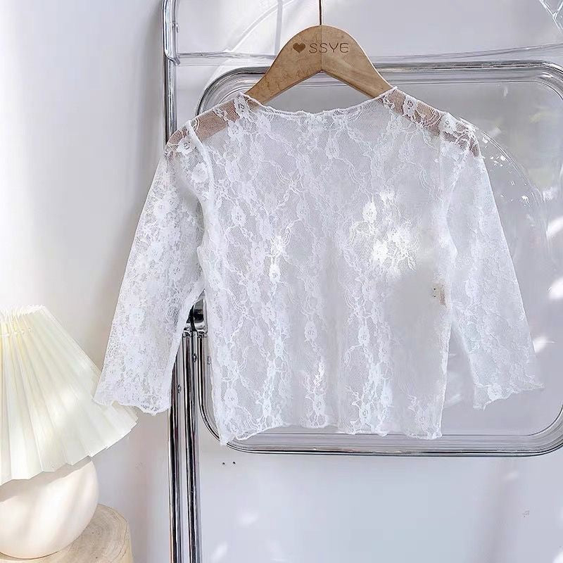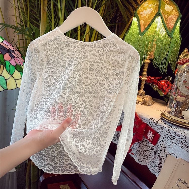 تيشيرت دانتيل بأكمام طويلة باللون الأبيض