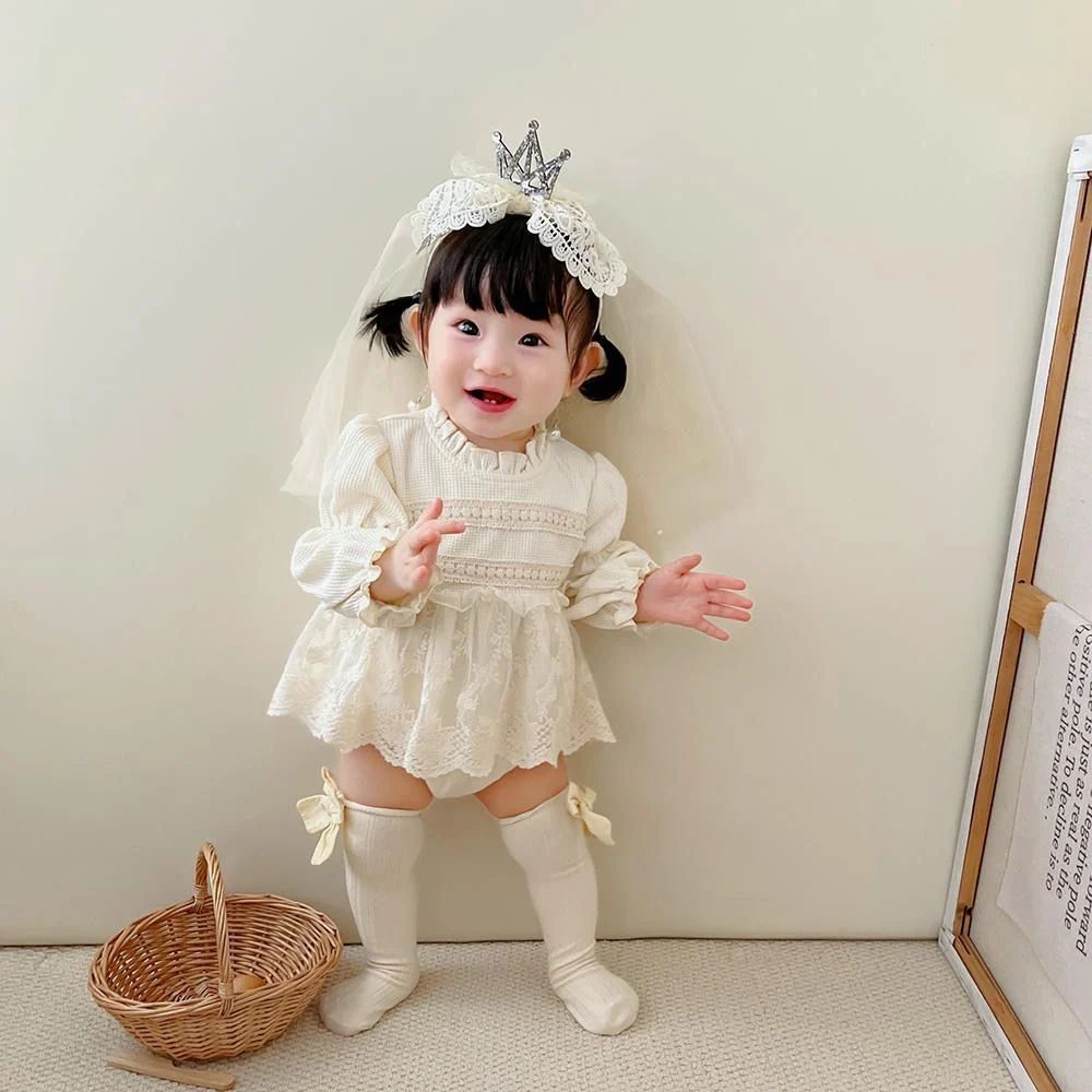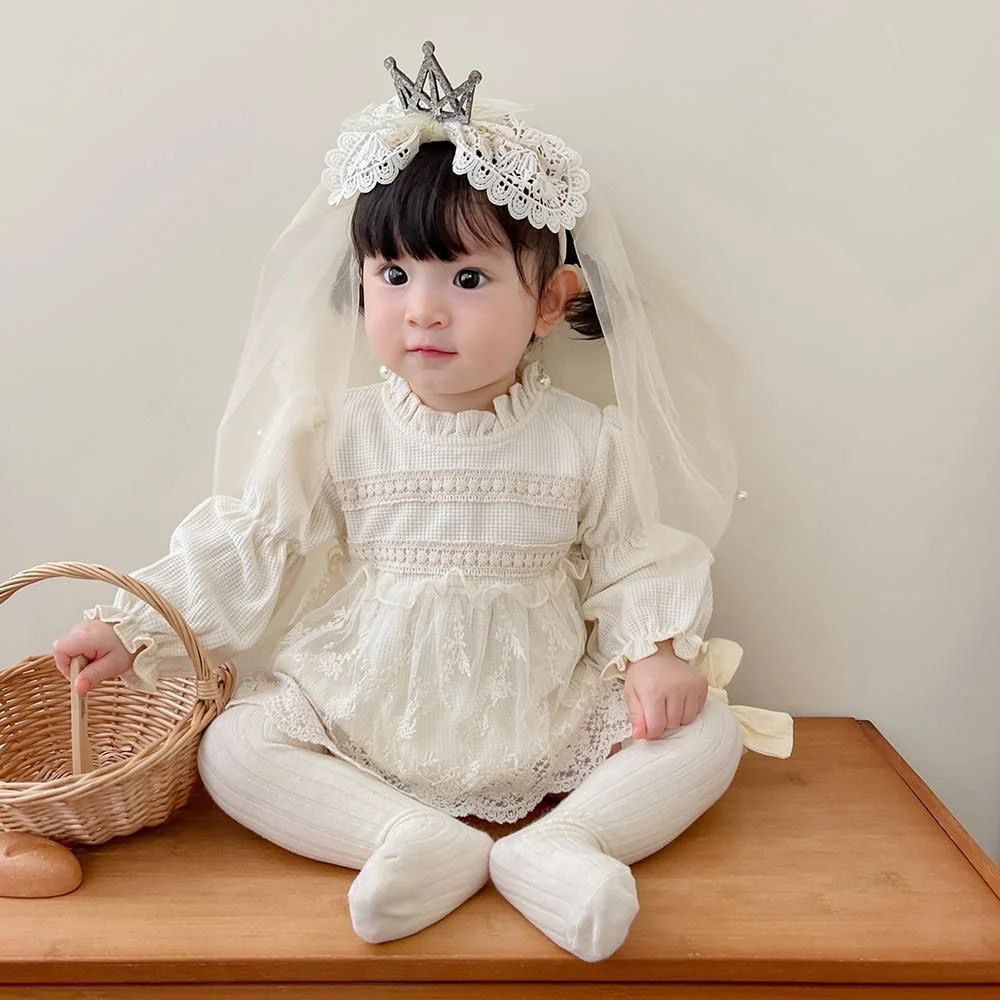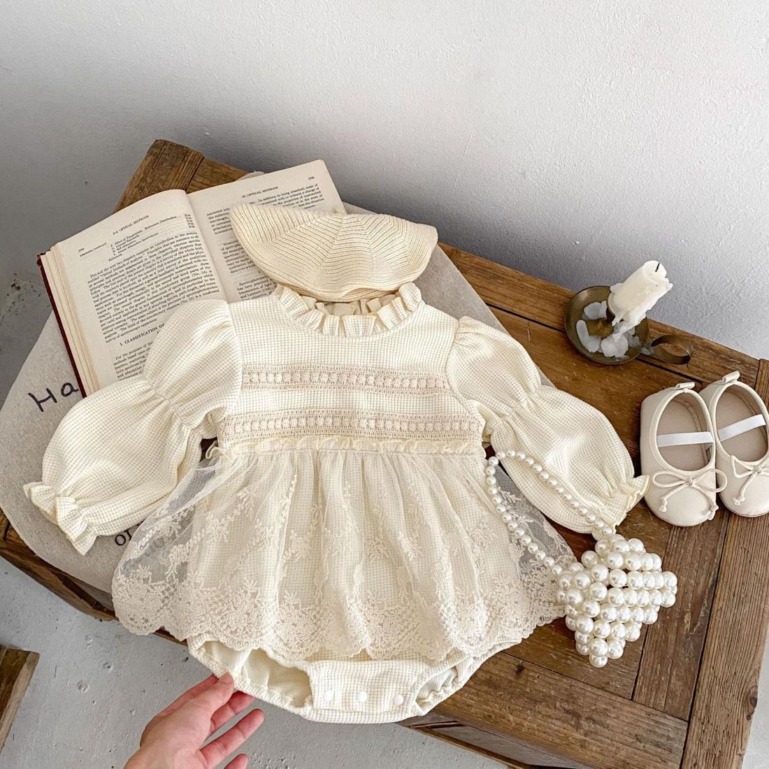 فستان رومبر بأكمام طويلة للأطفال مع تنورة من الدانتيل باللون البيج