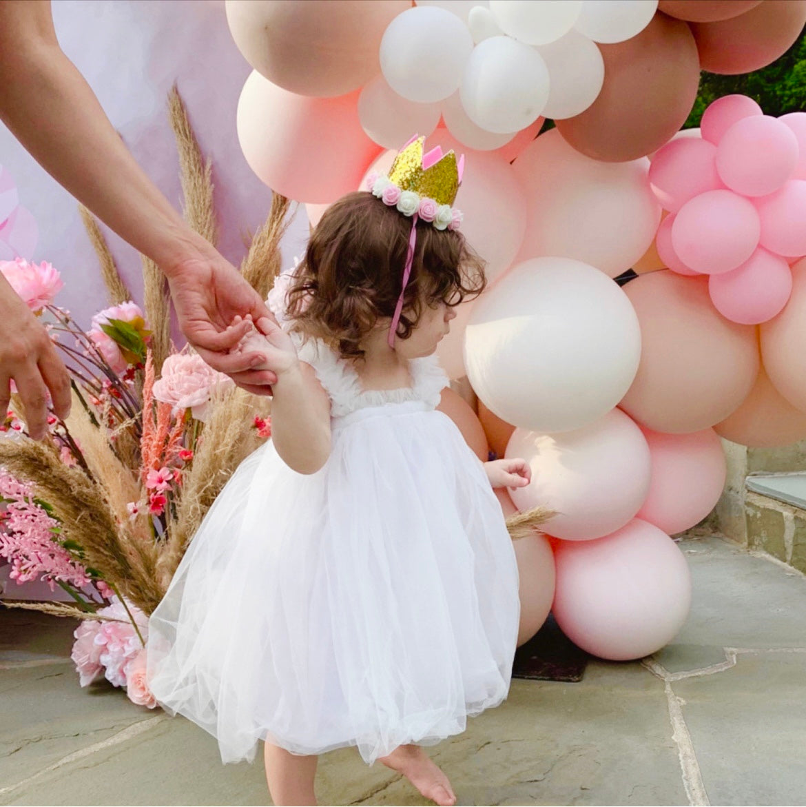 فستان توتو مصنوع من التول الناعم المنفوش مع بطانة مريحة للغاية. حزام كتف مرن يمكن أن يناسب الفتيات الصغيرات بشكل مثالي. شريط الرأس مصنوع من 5 قطع من الزهور الصناعية المختلفة التي تعد جميلة جدًا للطفل.